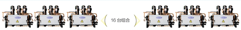 * 超大阵容16台机组组合,超强的兼容性,同一型号或不同型号间可以自由组合,可根据建筑面积灵活选择模块,保证冷量和建筑需求合理搭配。